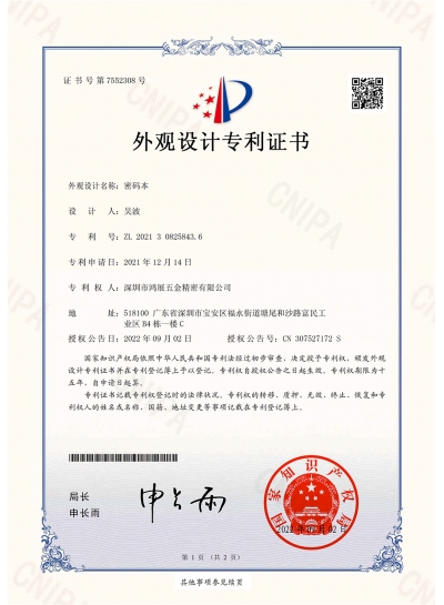 Password book appearance patent certificate