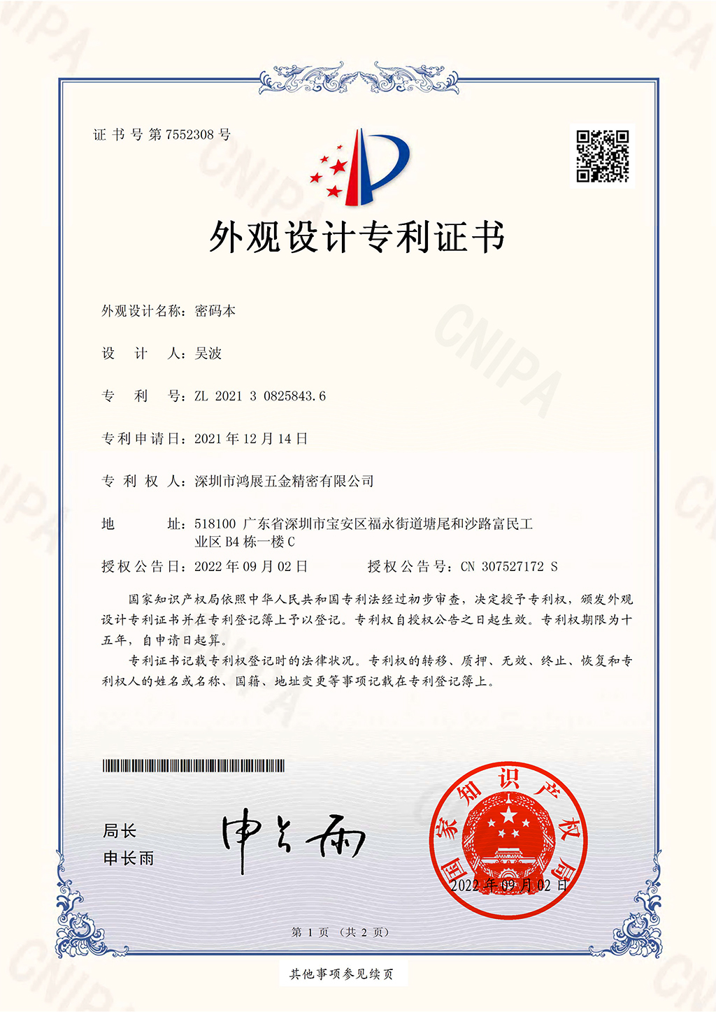Password book appearance patent certificate